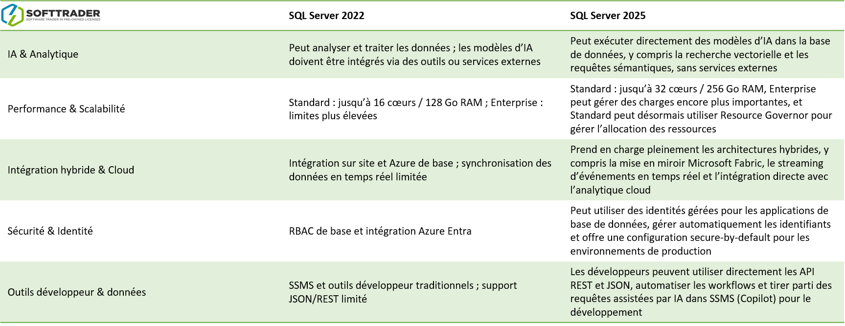 La principale différence entre SQL Server 2025 Standard et Enterprise réside dans l’évolutivité, les performances, la disponibilité et les fonctionnalités avancées.